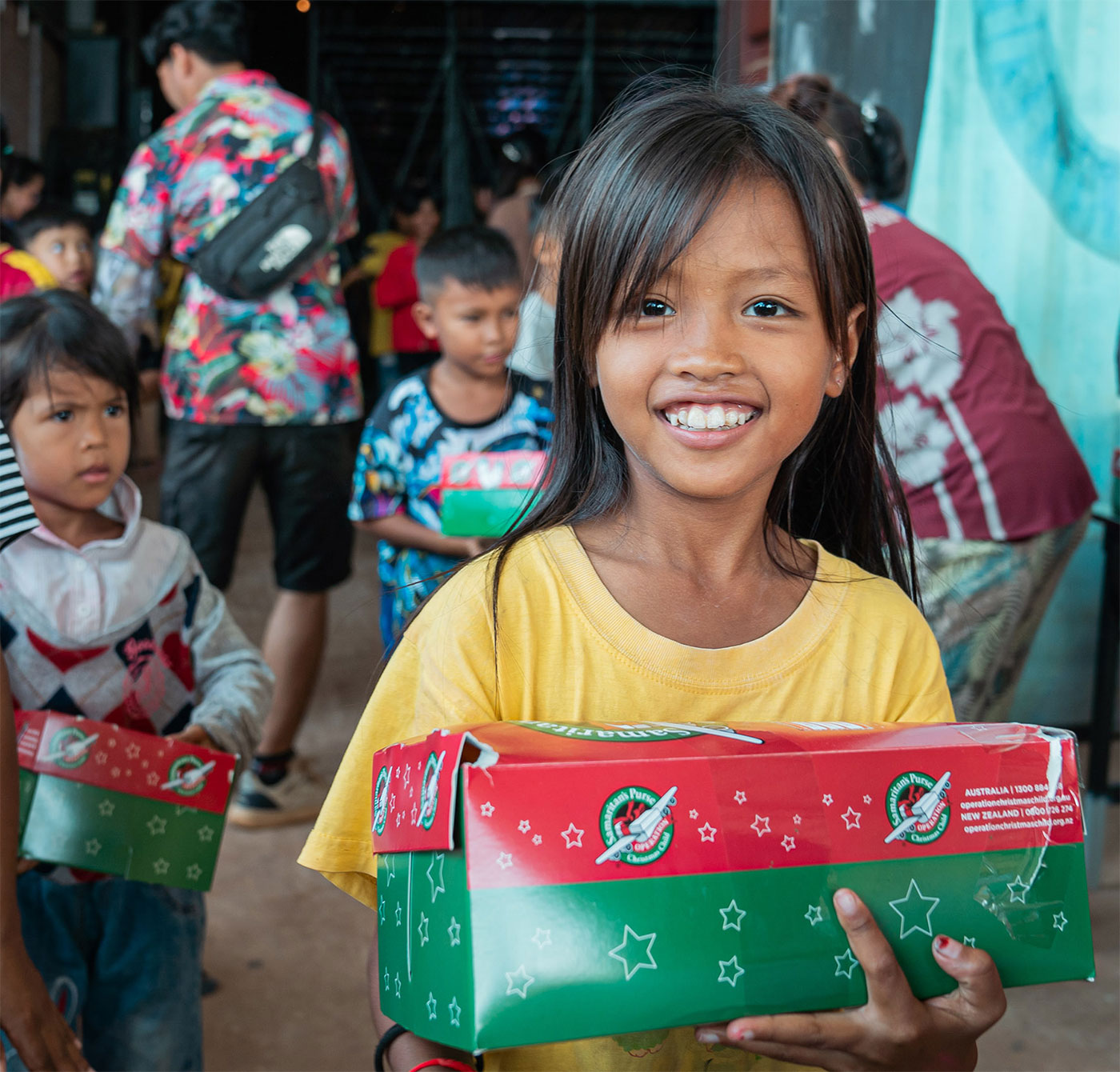 We will receive your order and send you your ordered items. You then pack your shoebox with your items.